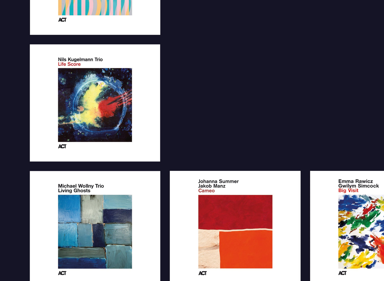 Vor diesem Hintergrund ergibt der unbedingte Zwang zur visuellen Identität von ACT bei den Cover-Artworks noch mehr Sinn. Jedes Design folgt einem festen Framework: ganz viel Whitespace, ACT-Logo, Artist und Titel des Releases in festgelegter Font, visuelles (fast immer illustrativ abstraktes) Element: fertig. Und das schon immer.